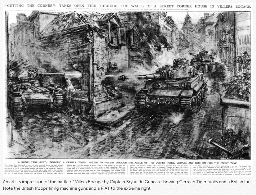 "Counterattack at Villers-Bocage" -- Six days after D-Day, the bastion of Caen was held too firmly to be taken frontally by the British 1st Corps. The decision was made to attack Caen from the sides, known as Operation Perch. A little after 0900 hrs, Squadron B of the 4th County of London Yeomanry arrived, as a point element, At Villers-Bocage with a section of the motorized infantry, 1st Rifle Brigade (called Green Jackets) and took up a position in the village. Squadron A continued to a position on the western slope of hill 213. The Germans decided to halt the encirclement. At 0915 hrs, a detachment of tanks from Schwere SS-Panzer-Abteilung 101 controlled by SS-Obersturmfuhrer Michael Wittman and supported by Panzergrenadiers, attacked the British at Villers-Bocage.Attacker: German (SS) (Schwere SS-Panzer-Abteilung 101/Panzer-Lehr Division)