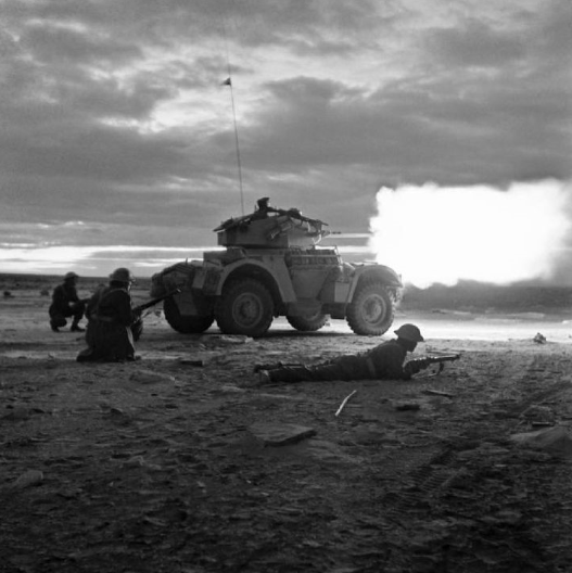 "Last Fight" -- Since January 18th, French troops in Tunisia had been being roughed up by a violent enemy offensive which aimed at gaining control of the western ridge, thus impairing Allied attacks and giving some breathing room to the Axis. Poorly equipped, the French forces, including the 7th Moroccan Skirmisher Regiment, had to give up ground. After the 25th, the situation improved, due in part to the terrain which was more hilly and in part to the intervention of Anglo-American reinforcements. Intense fighting took place on the road to Ousseltia. The Germans were worried and they launched yet another attack on the 31st. 11th Company, 7th RTM, installed on Wadi Drijda was forced to withdraw by the Gebirgsjägers fighting along side the panzers. The enemy was infiltrating towards the road the to Bou Saadia crossroads. The Commandant of the 3rd Battalion of the 7 th RTM ordered his 9th Coy to counterattack with British armored cars in support.Attacker: French / British (9th Company, 7th Morrocan Skirmisher Regiment and Derbyshire Yeomanry/11th Company, 7th RTM)