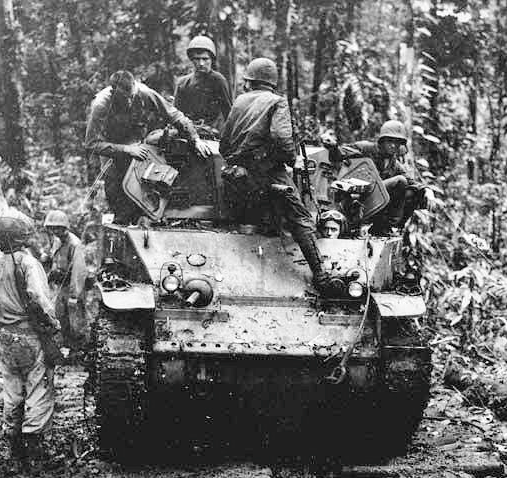 "Ghosts in the Jungle" -- After the successful landings led by the Marines of the 1st Provisional Marine Brigade and the 3rd Marine Division, the American foothold on Guam was no longer threatened. The 77th Infantry Division was entrusted with the task of mopping up the island in the face of a greatly weakened enemy, one still capable of determined resistance. The Barrigada district, in the north-eastern part of the island, was the scene of heavy fighting; the Japanese were desperately resisting access to the village and were clinging to the edge of the jungle that lay to the east. The first attack on the ‘Green House’ by B Company, 307th Regimental Combat Team, had failed by the afternoon of the 2nd, with the result that the left flank of the battalion was now exposed. In order to reestablish contact with B Company, now cut-off to the north-west, Company G was dispatched to take and hold the area with the help of some light tanks.Attacker: American (G Company, 307th Infantry Regiment and D Company, 706th Tank Battalion)