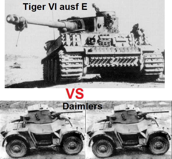 Shortly after the Battle of Wadi Akarit, two Daimler armored cars of 11th Hussars were on a patrol when a large enemy tank, a Tiger VIE, was spotted. They moved in to engage it. To their credit, the armored car crews had not appreciated that their prey was disabled before they began their hunt.Attacker: British (11th Hussars)