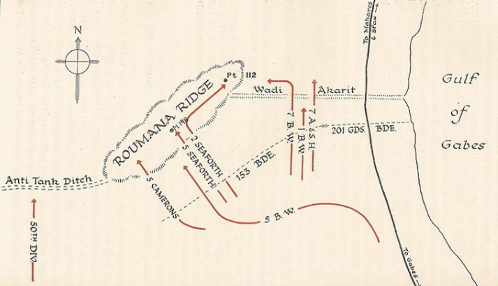 The end was near for the Axis forces in Tunisia, compressed from both sides into an ever-decreasing pocket against the Mediterranean Sea. The southern perimeter of the pocket was anchored by the impassable Shott el Fedjoj in the west and the sea in the east. German and Italian engineers had dug extensive anti-tank ditches across open ground not already protected by natural barriers. The British had no choice but to make a frontal attack, and the task of securing Roumana Ridge fell to the men of the 51st Highland Division. AT 0330 hours, the 5th Cameron and 5th Seaforth Battalions began their ascent. The Italian defenders offered no more than token resistance, at dawn the Scots were on top of the ridge seemingly successful. Then the real shooting started.Attacker: British (5th Cameron and 5th Seaforth Battalions, 51st Highland Division)