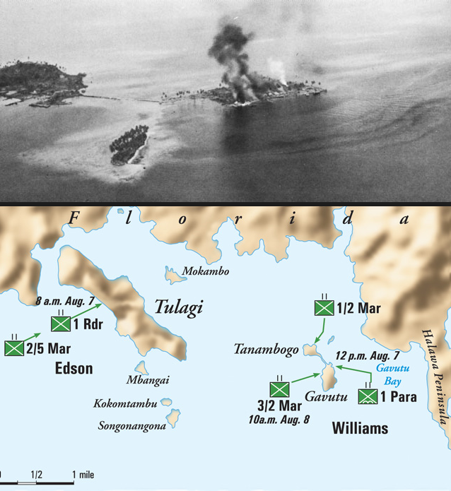 In the first aggressive Marine operation of the war, the Second Marine Division (along with the 1st Paratroop Battalion and 1st Raider Battalion) executed amphibious invasions of Florida, Tulagi, and Gavutu Islands, just north of Guadalcanal; this happened in conjunction with the 1st Marine Division's invasion of Guadalcanal. While resistance on Florida and Guadalcanal was quite light, there were fierce engagements being fought on Tulagi and Gavutu, and on Gavutu, the Paratroopers were taking flanking fire from the tiny coral island of Tanambogo. B Company of the 1/2 2nd Marines was sent to invade Tanambogo and take care of the "15 or so Jap snipers".Attacker: American (USMC) (B Company, 1/2 2nd Marine Division and Heavy Weapons Platoon)