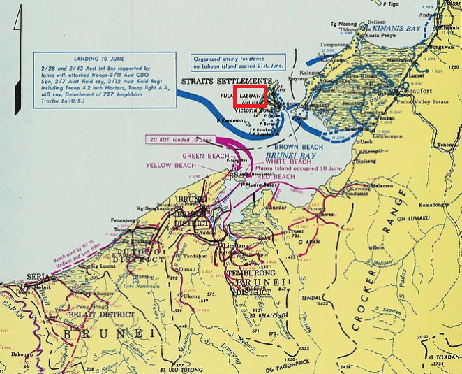 After a textbook landing, the men of the 2/28th Battalion moved rapidly inland from “Brown Beach”, meeting little resistance as they moved through the heavily damaged Labuan town. Not all the Japanese were gone however, and two were shot moments before Generals MacArthur and Morehead, the Australian Divisional Commander, arrived with an entourage of photographers to inspect the landing. Ahead of the celebrities, the bitter realities of war srtarted again, with fighting increasing as the troops pushed north. D (“Don”) Company, under Captain Eastman, had been tasked with taking a bridge over a canal that lay astride “Baker” route and the high ground that lay beyond. The bridge was found to have been blown. Infantry from the first section moved across the tumbled cement slabs of the ruined bridge and the waiting Japanese opened fire with rifles and machineguns.Attacker: Australian (2/28th and 2/29th Battalions)