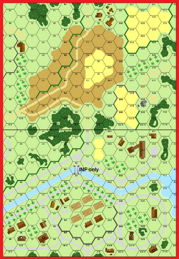 | Misc Rules: | PTO, LJ (Exc: roads exist) Ov5, bridge can only support infantry w D: BT, Entrenchments, Minefields |