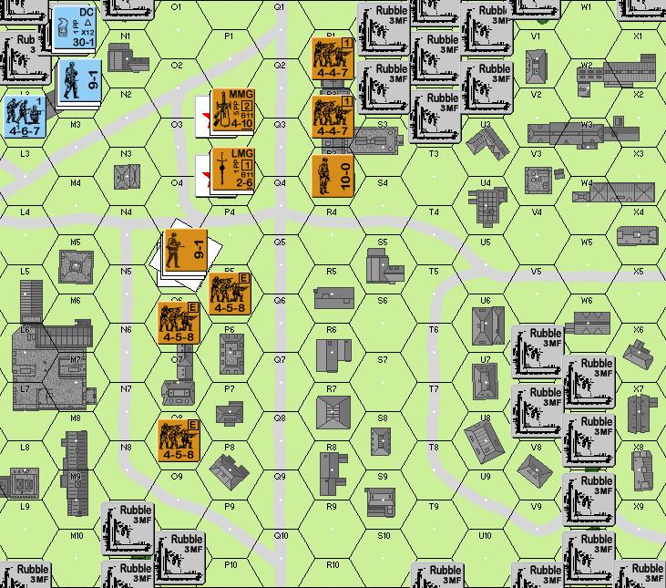 | Misc Rules: | Woods and Orchards: Stone Rubble. Cost 3 MF to enter, +3 TEM, block LOS as if inherent bldg |