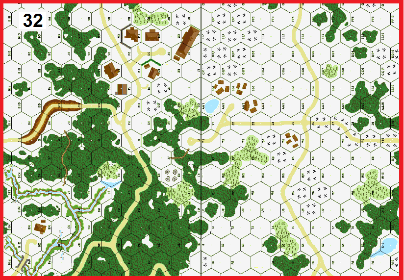 I got the attacking Germans and sent my attack at Jim's right flank. My objective was to take building 32C1 and make it a firebase to cover a rush to the 38EE7 woods. I sent one 467 to the frozen stream to check if any [?] there were real Russians. I got both Panzers and three squads with two leaders to the VC road by GT4. The trick was staying unbroken! The fire from my kill stack in 32C1 did the trick and I rushed squads past the VC road for a solid win. Jim: Vic's fire and SMOKE was very effective early, and I was down 10 CVP in three turns. I broke some attacking squads, but I couldn't get the double breaks needed to reduce or kill MMC. My 8-1 and HS going berserk and rushing to their deaths didn't help! The reinforcing AEs had to break all or kill all the Germans east of the VC road (and help the 76L kill the Panzers). I got the Panzers but not the squads. By turn 6, I had two GO 628s left and that's how it ended. Vic had 7 squads east of the VC road and 20 VP to my 13. It's a good scenario that challenges both players.