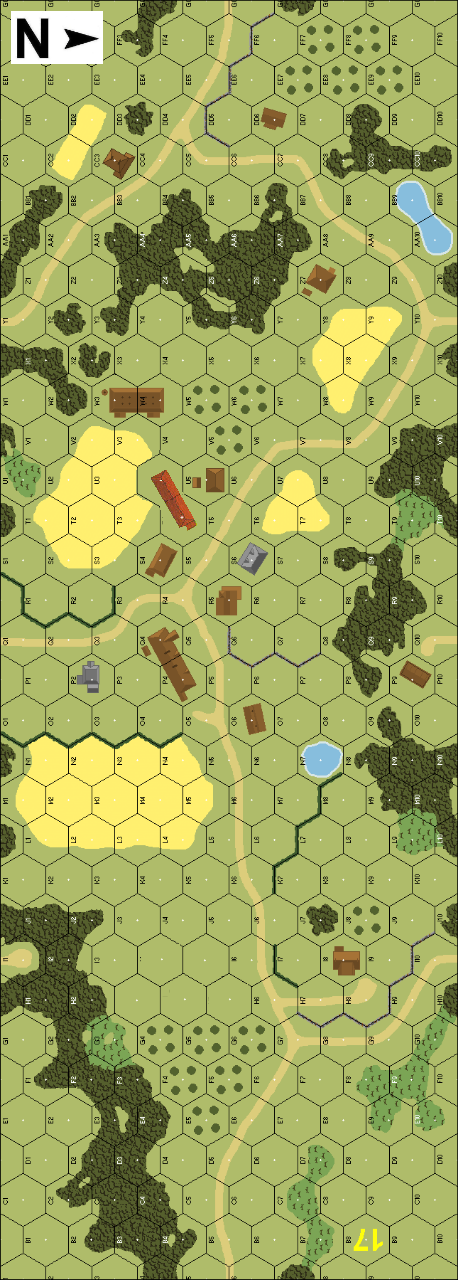 "Red Storm" --- Launched on 22 June 1944 in Belorussia, the Bagration Offensive succeeded beyond the wildest expectations of STAVKA. Army Group Center suffered huge losses, and on 3rd July the Red Army recaptured Minsk, sealing the fate of tens of thousands of encircled German troops to the east of the city. The attackers tried to exploit their success and continue their advance westward. In the sector the 1st Belorussian Front, the Cavalry Mechanized group under General Pliev pushed through the Pripet Marshes, followed by the infantry. The Germans tried to slow them down by committing all available forces. One of these was the Hungarian 1st Cavalry Division, a formation lacking effective anti-tank weaponry against the Soviet tanks. . . . .Victory Conditions: The Russian player wins, if at the end of the scenario, he controls more multi-hex stone buildings than the Hungarian player.Attacker: Russian (Elements 54th Guards Rifle Division)