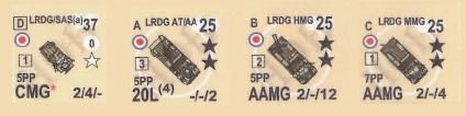 | AFVs: A:0 LRDG/SAS(a) x 2 LRDG AT/AA LRDG HMG2 LRDG MMG2 x 5 |
