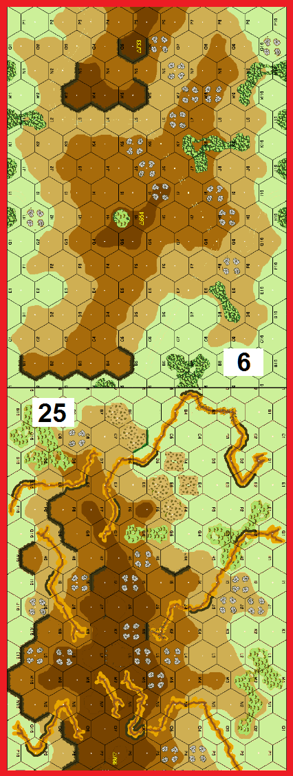 | Misc Rules: | Wood: Brush, Bldgs: Crags, No Roads, Orchards: Cactus Patches (B14.7) |