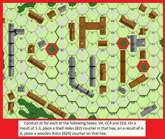 | Misc Rules: | Hexes V4, CC4 and EE6 will have either Shellholes or Wood Rubble on dr |