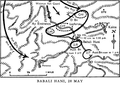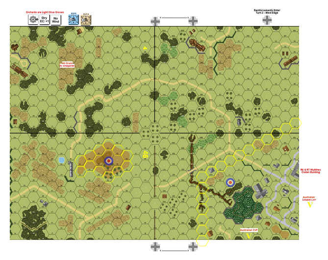A stalemate had settled around Heraklion. The Germans lacked the strength to take the town and airfield, but each day that passed saw their position improve as reinforcements trickled in. The Allies could do little more than their orders required: to hold the town and airfield until relieved. A platoon from the 2/4 Battalion AIF was dispatched to occupy the heights of Hill 296, known to the Australians as Apex Hill. For two days Lt. Kesteven and his men observed Germans movements. At dawn on the 26th it became clear that Apex had become untenable, as a group of Germans had moved between the hill and the village of Babali, a Black Watch outpost. After sending a last signal saying they would attempt to breakout, Kesteven led his men down the rocky slope.Attacker: Australian / British (Detached Platoons, 4th Battalion, 2nd Australian Imperial Force and elements of 2nd Battalion, Black Watch Regiment)