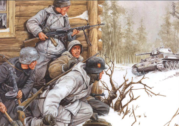 At the beginning of February 1943, the Soviet 55th Army aimed to break the vital Leningrad-Moscow Highway and to encircle the German unit in the Mga sector. The pivot point for this highway was Krasny Bor held by the Spanish Azul Division. After an intensive shelling of the Spanish fortified positions, 44,000 Russian soldiers supported by 100 tanks launched the attack on the morning of the 10th. By 10:30 the majority of the town was in Soviet hands and Russian units were attacking the command post of the 262th Regiment located in the hospital on the southern edge of the town.Attacker: Russian (45th Rifle Division and 31st Armored Regiment)