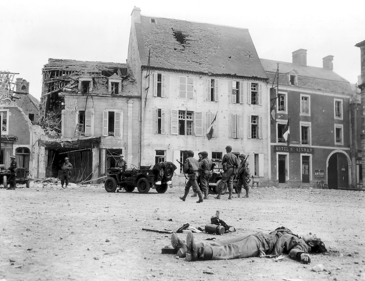 The body of a dead German soldier lies in the main square of Place Du Marche in Trevieres after the town was taken.