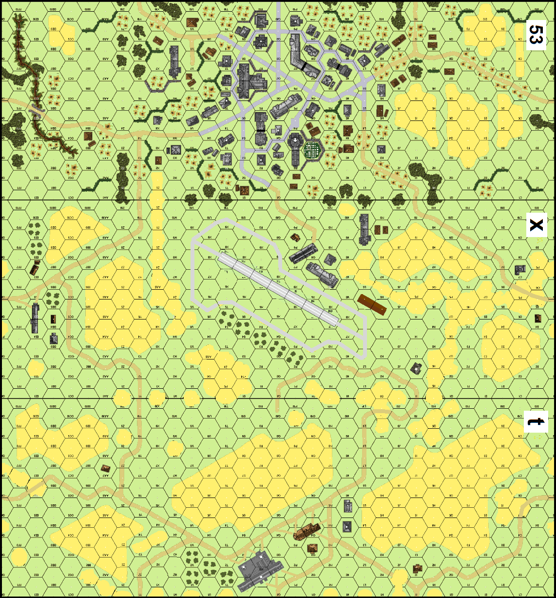 | Misc Rules: | Bd 53 Orchards: Shellholes. Bds t and x Woods/Brush: Grain. A: Air Support (E7) |