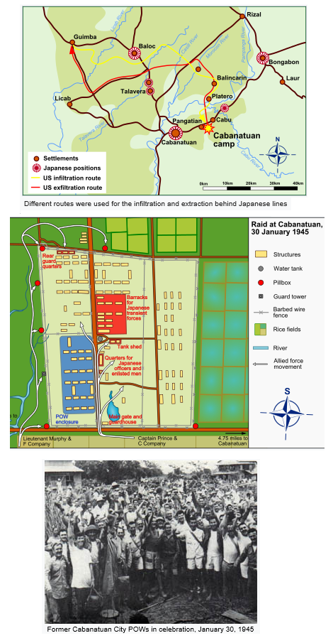 The Raid at Cabanatuan, also known as The Great Raid, was a rescue of Allied prisoners of war (POWs) and civilians from a Japanese camp near Cabanatuan City, in the Philippines. On January 30, 1945, during World War II, United States Army Rangers, Alamo Scouts and Filipino guerrillas liberated more than 500 from the POW camp. In a nighttime raid, under the cover of darkness and a distraction by a P-61 Black Widow, the group surprised the Japanese forces in and around the camp. Hundreds of Japanese troops were killed in the 30-minute coordinated attack; the Americans suffered minimal casualties. The Rangers, Scouts, and guerrillas escorted the POWs back to American lines. The rescue allowed the prisoners to tell of the Bataan Death March and prison camp atrocities, which sparked a new rush of resolve for the war against Japan.Attacker: American / Filipino (C Company and 2nd Platoon, F Company, 6th Ranger Battalion, Alamo Scouts and Filipino Guerrillas)