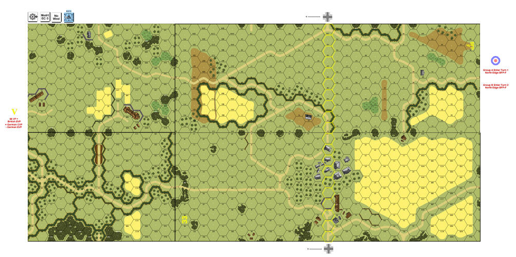 The Sherman tanks of 3rd Royal Tank Regiment were in the lead of the armored charge of Operation Goodwood. Thanks to the suppression of the German defenses by Allied bombing and the speed of the advance, they did not encounter any significant opposition. However in their path were the Nebelwerfer batteries of the 272nd Brigade and the self-propelled guns of Batterie 3 of Sturmgeschutz Abteilung 200, commnded by Major Becker. Belying their ungainly appearance, the self-propelled guns were well placed to use their high velocity 75mm and 105mm ammo against the lightly armored Shermans.Attacker: British (Elements of A Squadron, 3rd Royal Tank Regiment, 29th Armoured Brigade, 11th Armoured Division)