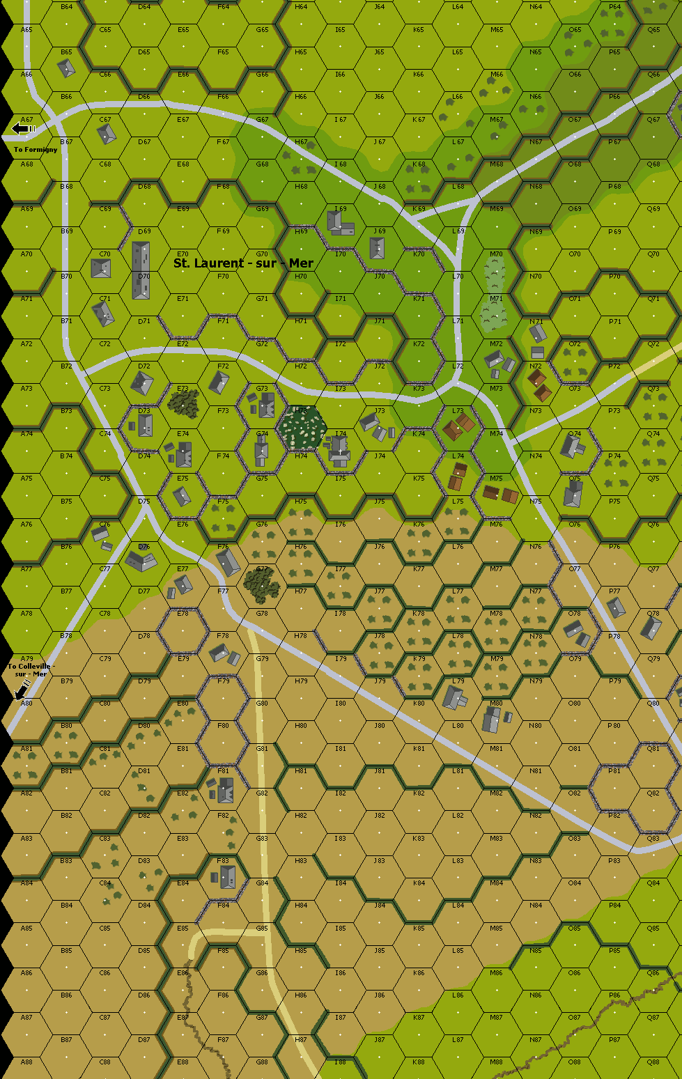The 115th Infantry had expected to land with dry feet on D-Day, then march several miles inland to their first objective. Instead, they had to pick their way through German minefields, and then mount a frontal attack on St. Laurent. French civilians pointed out the source of the trouble: the Germans were well positioned in the town's squat Romanesque church and a big stone barn. At about 1515 hours, the 2nd Battalion under Lt. Col. William Warfield began its attack.Attacker: American (F/115, K/115, 741 Tank Bn.)