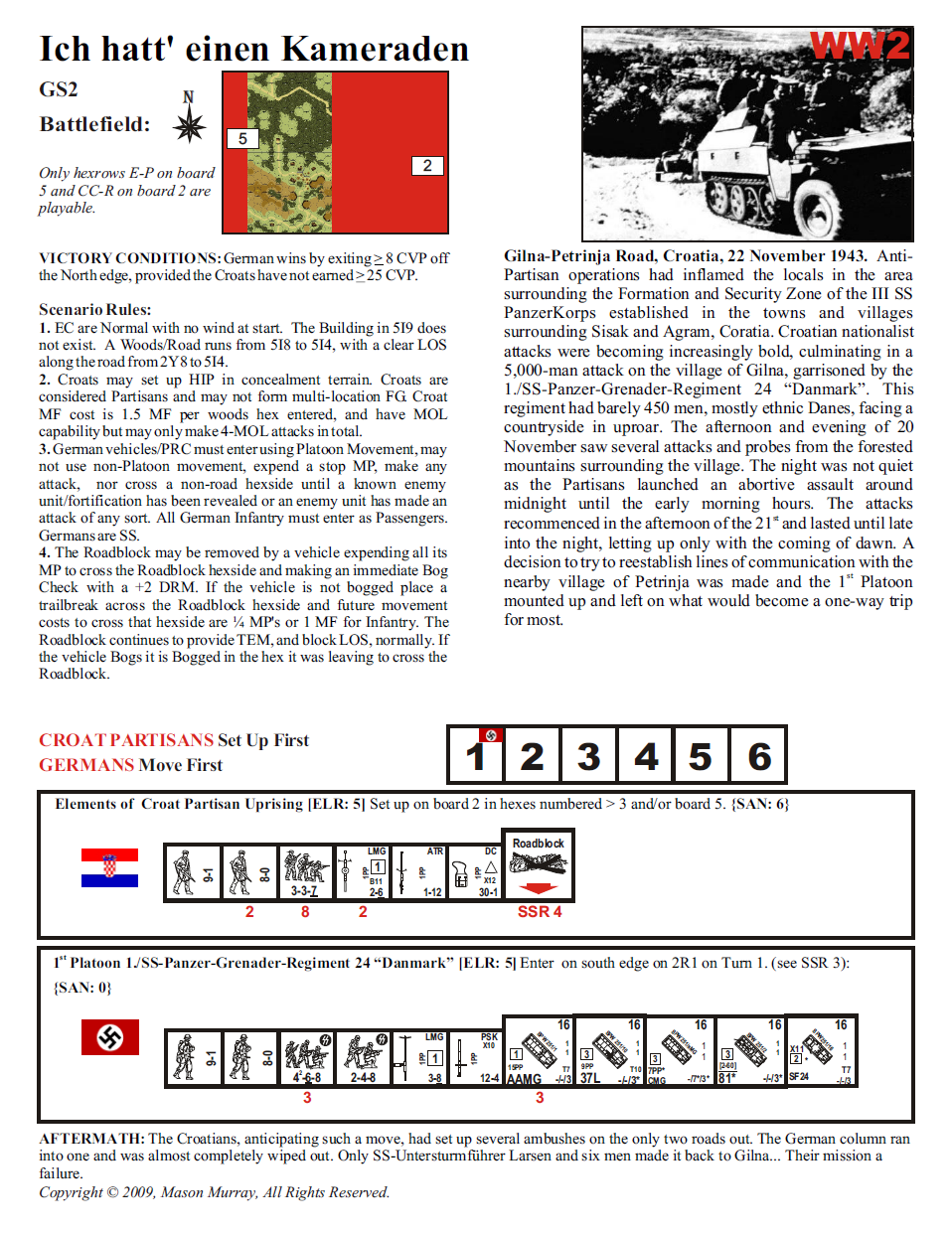 Anti-Partisan operations had inflamed the locals in the area surrounding the Formation and Security Zone of the III SS PanzerKorps established in the towns and villages surrounding Sisak and Agram, Coratia. Croatian nationalist attacks were becoming increasingly bold, culminating in a 5,000-man attack on the village of Gilna, garrisoned by the 1./SS-Panzer-Grenader-Regiment 24 “Danmark”. This regiment had barely 450 men, mostly ethnic Danes, facing a countryside in uproar. The afternoon and evening of 20 November saw several attacks and probes from the forested mountains surrounding the village. The night was not quiet as the Partisans launched an abortive assault around midnight until the early morning hours. The attacks strecommenced in the afternoon of the 21 and lasted until late into the night, letting up only with the coming of dawn. A decision to try to reestablish lines of communication with the nearby village of Petrinja was made and the 1 Platoon mounted up and left on what would become a one-way trip for most.Attacker: German (SS) (1st Platoon 1./SS-Panzer-Grenadier-Regiment 24 “Danmark”)