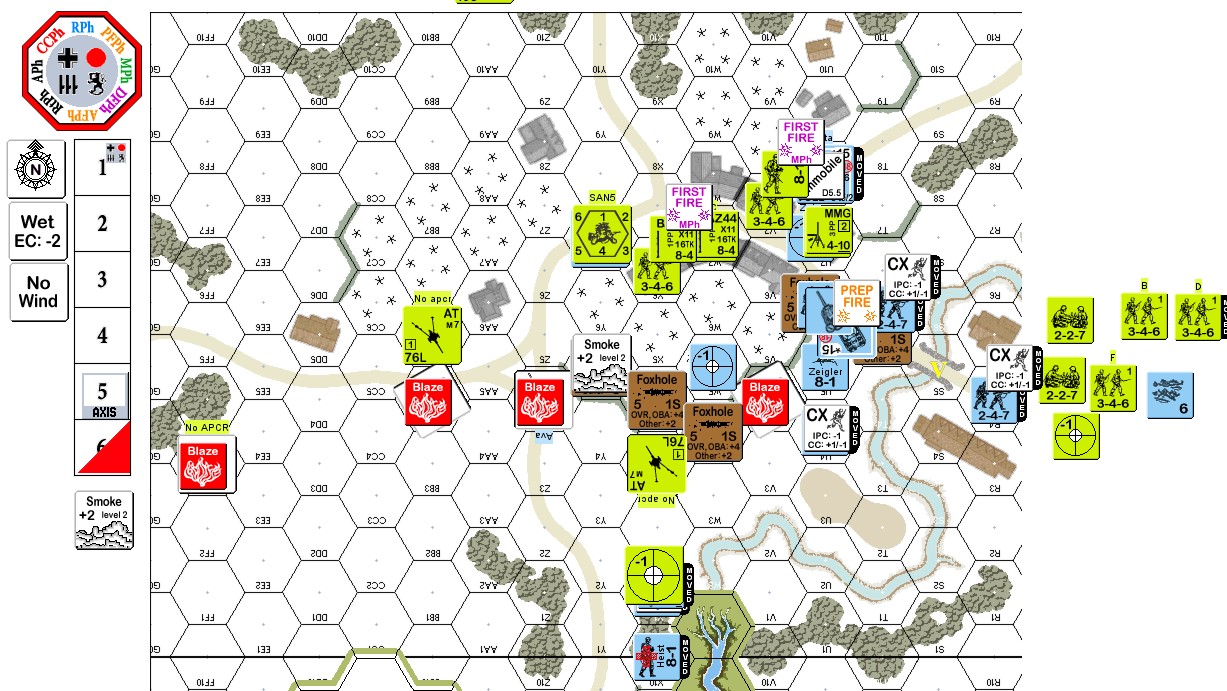 | 2026-04-10 | (A) Neil Andrews | vs | Powell Rhys | American win | The plan was going well. The Germans managed to get to the centre woods using the hedges as cover. The Hellcat couldn't get off a decent shot, withdrew at the earlies opportunity. And I took the shot at it to kill it as it left. Mainly to create a bit of smoke for cover Then it all went wrong. 2 Panthers killed to an ATG on the left flank to a 3 TK and a CH in three shots. The other Panther attempted to flank this gun only to find the other one. This wasnt a CH, but the resolution was snakes. With the 3 IVs left and the infantry intact it was still ok In a US turn, a Baz at 3 hexes range nailed one of the IVs with some more low DRs. At least my infantry got revenge on baz team, the 8-1 and one of the gun crews. They ran away So in my turn I used both the IVs to get smoke for cover I would need. A bit of a risk, but it would work out with 2 nice bits of fluffy cover. Well thats what I thought. The ATG fired at a Squad through the smoke. Not only a hit, but another snakes on resolution. Red Mist Then a HS broke to a 346 that even though cowered it rolled a 4, and that was enough for the MC that the HS would fail. Down to another HS, a full sqd and the leader. There were only 2 US units left that could fire at me, one of them clouded with smoke. Oh, but Rhys neednot have worried 346 point blank with +4 all up, He rolled another 3 which meant another MC which I of course I failed. At least this choak point had any resid thanks to the smoke. Now the 9-1 and his mate could run past pretty unscathed by this one and aim for the VC hexes 1 HS at LR was all in needed to deal with No Problem, another 3 later and a 1KIA it was all over Well done Rhys | ||