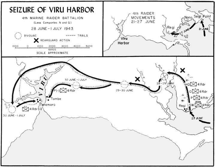 The Battle of Viru Harbor was a battle of the Pacific campaign of World War II that took place on New Georgia island during the New Georgia Campaign from 28 June – 1 July 1943. A battalion of U.S. Marine Raiders landed at a remote location, marched overland, and attacked a force of Imperial Japanese Navy and Army troops that were guarding Viru Harbor. The Marines drove the Japanese out of Viru, which was then occupied by additional U.S. Army soldiers and U.S. Navy personnel and ships.Attacker: American (USMC) (4th Raider Battalion)