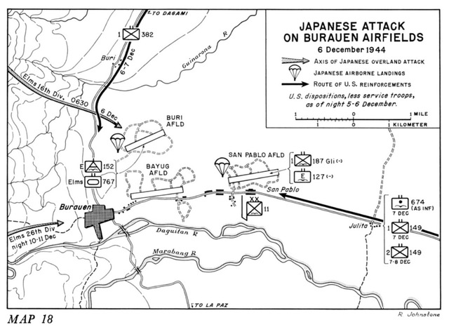 Japanese aircraft approached the San Pablo Airstrip on 6 December; bombers circled overhead dropping their payloads while fighters remained above providing cover. The transport aircraft dropped elements of the Katori Shimpei Force, comprised of the 3rd and 4th Raiding Regiments. The paratroopers dropped for the first time carrying their individual weapons, in what would also be the last Japanese parachute drop of the war. The airfield was defended mainly by mixed rear echelon personnel.Attacker: Japanese (Katori Shimpei Force)