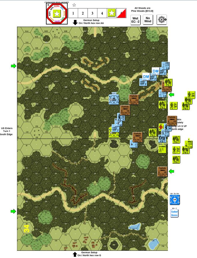 | Misc Rules: | Pine Woods (B13.8). A: 2 Heroes at start w D: Fire Lanes SSR |