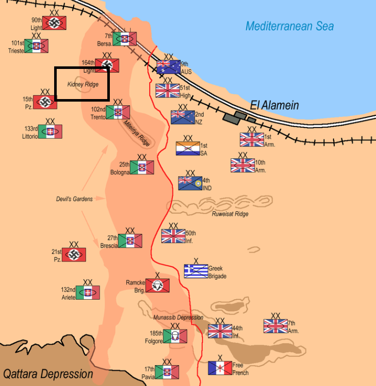 Things heated up in the Kidney Ridge sector soon after first light on 25 October. British units began to feel for German defended localities, behind the minefield outposts where Rommel hoped to destroy whatever enemy elements that succeeded in penetrating his Devil’s Garden. His first move came in the form of a successful deployment of the Pakfront. The British overnight attack at Point 33 was stopped cold when six leading Shermans were shot up by the anti-tank screen. After German command tanks probed forward at noon the whole frontage of the Kidney sector was struck with numerous, but poorly coordinated, armored attacks, mounted by 15th Panzer and the Italian Littorio Division. The last and heaviest attack was mounted with fifty-five tanks and fell upon the 9th Lancers and the Bays, the latter down to only three Shermans. . .Attacker: British (Elements of the 7th Rifle Brigade and of the 1st Armoured Division and RAF air support)