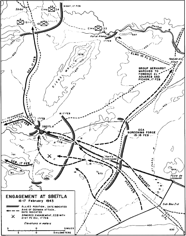 The Germans in Tunisia, while caged, were not close to being tamed. Despite surrendering the strategic initiative, they carried out a number of counter-attacks and local attacks. One such operation was Operation Fruehlingswind (Spring Wind), which had as one of its objectives the town of Sbeitla. The morning of 16 February witnessed American armored units counter-attacking to try and push back two aggressive German colurnns. A pitched battle ensued, with strong armored forces, artillery and aircraft engaged by both combatants.Attacker: German (elements Kampfgruppe Pfeiffer, 21st Panzer Division)
