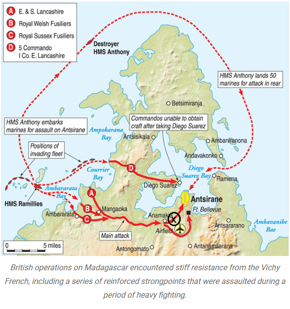 The British launched Operation Ironclad on 5 May in order to prevent the Japanese from using Madagascar as a submarine base. They landed on the Vichy French occupied island, and surprisingly met little to no resistance. Further inland, however, the French resolve stiffened. The 2nd Royal Welsh Fusiliers, now 6 or 7 miles inland, came under fire as they approached Col de Bonne Nouvelle. The Fusiliers found the Vichy French defending a rocky hill fortified with trenches, pillboxes, and wire, as well as artillery pieces that guarded the gateway to the port of Antsiranana (Diego Surez).Attacker: British (Reinforced 2nd Royal Welsh Fusiliers)