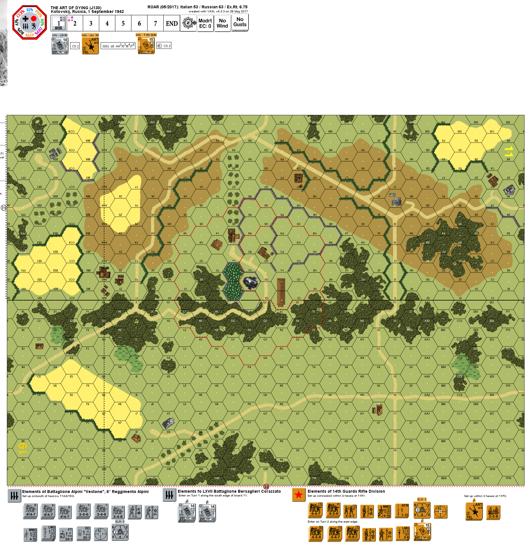 After a hard struggle, the Red Army had succeeded in establishing a significant bridgehead at Serafimovich, on the west bank of the Don. The German XVII Corps and the Italian XXXV Army Corps were assigned to a joint counterattack. At the crack of dawn, after a short artillery preparation and number of Stuka bombings, the confidant Italians attacked. Despite a hard defense, and significant Italian losses, the Russian lines were broken, and the defenders were forced to retreat. Later that day, the order was given that the secondary target of the attack, Kotovskij, was to be assaulted.Attacker: Italian (Battaglione Alpini "Vestone," 6° Reggimento Alpini and LXVII Battaglione Bersaglieri Corazzato)