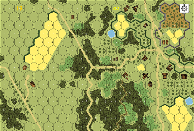 2014-06-11(D) X von Marwitz vs Daniel Takai German winLooked like an interesting scenario with lots of moving around, repositioning, and delaying action. I had the Free French in this one, who wasted some of my sympathies for them because I had to learn that despite using British counters, they are subject to Cowering... The Germans need to capture a number of buildings on board 42, which is not renown for having lots of clear LOS. With the OB-given Foxholes, an up-front defence seemed in order as the attacking Germans had to cross a rather open board 19. The Southern (left) side was protected by no less than five hexes of OG. The south offered the protection of a large grainfield and a hedge to hide behind on the advance. Thus I put my Schwerpunkt on my right side. The left open ground was covered by no less than 2 full squads, one with MMG, the other with 60mm MTR and 8-1 to either to be in place to stop an approach on that flank or poised to redeploy to the central woods quickly to cover the 19I1-A3 axis and 19I1-P4 axis simultaneously. Together with the 2nd MMG, approaches to the central woods area could be covered by Fire Lanes. On the right, the B4/A4 gap was heavily covered by 4.5 squads, the 9-2, MMG, and a BAZ, partly taking advantage of the 19I1-A5 axis. The two squads & leader required to set up in the headquaters buliding were able to rush to the right flank or center as reinforcements where needed. My plan for them saw them in the center, while the right would be strenghtened by the reinforcements of Free French turn 3. Overall, I think, my plan to slow the attackers on the rather dangerous grounds of board 19 to then fall back delaying the German was sound.