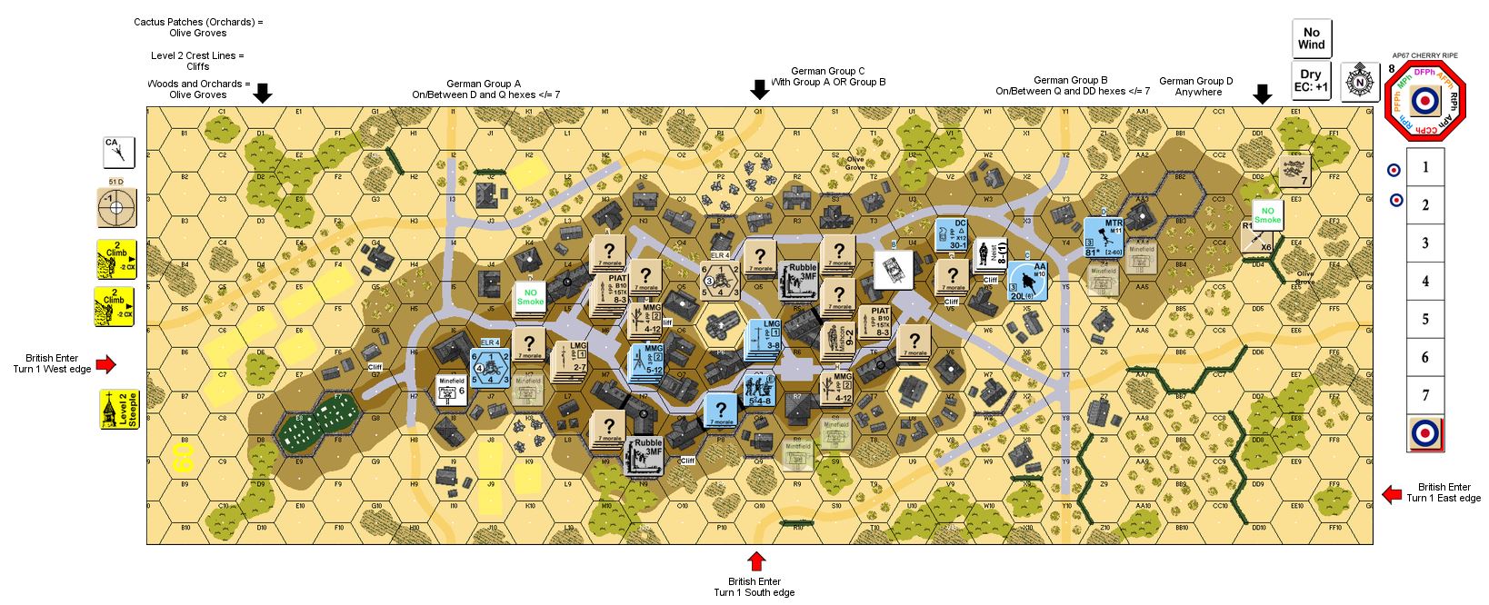 | Misc Rules: | Stone buildings, Treat Woods as Olive Groves, level 2 crest lines are Cliffs |