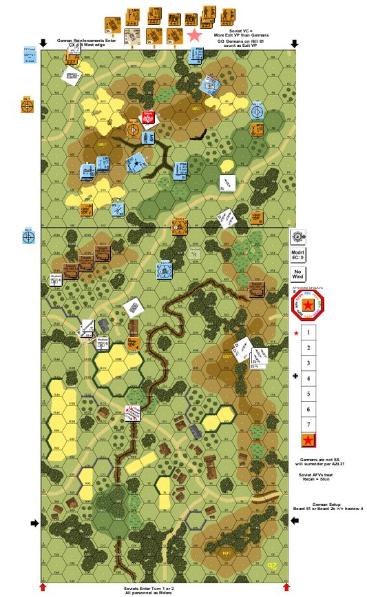 The Red Army launched the Lvov-Sandomierz offensive after OKH had stripped Army Group North Ukraine to the bare bones in order to plug the holes left by a crumbling Army Group Center. This attack was a major operation in its own right, designed to liberate the last remaining Soviet territory still being held by the Germans. To help slow the Bolshevik hordes, the Nazis recruited thousands of Russia-phobic local nationalits groups to aid in the defense of their homelands. One such unit was called SS-Infanterie-Division 14 “Galicia”, though it was composed mainly of Ukrainian troops with German officers. Although only nominally trained, they were determined to give a good fight on the rolling hills of eastern Poland.Attacker: Russian (Cavalry Mechanized Group Baranov)