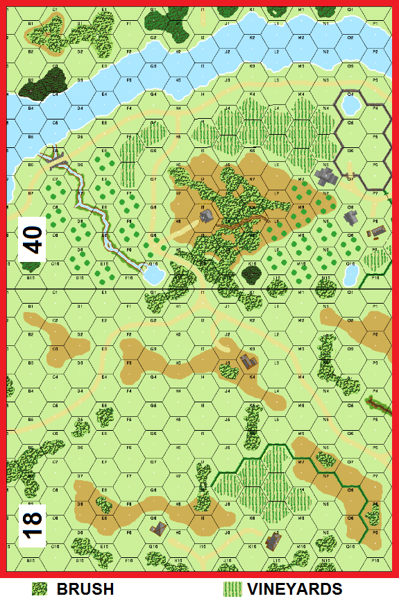 | Misc Rules: | Woods are Brush, Grain is Vineyards. Olive Groves. Stone bldgs |