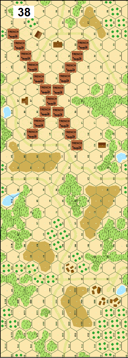 | Misc Rules: | Grain is Level 1 hills, Woods/Marsh is Brush. Treat airfield as Trench hexes. Light Dust. A: Air |