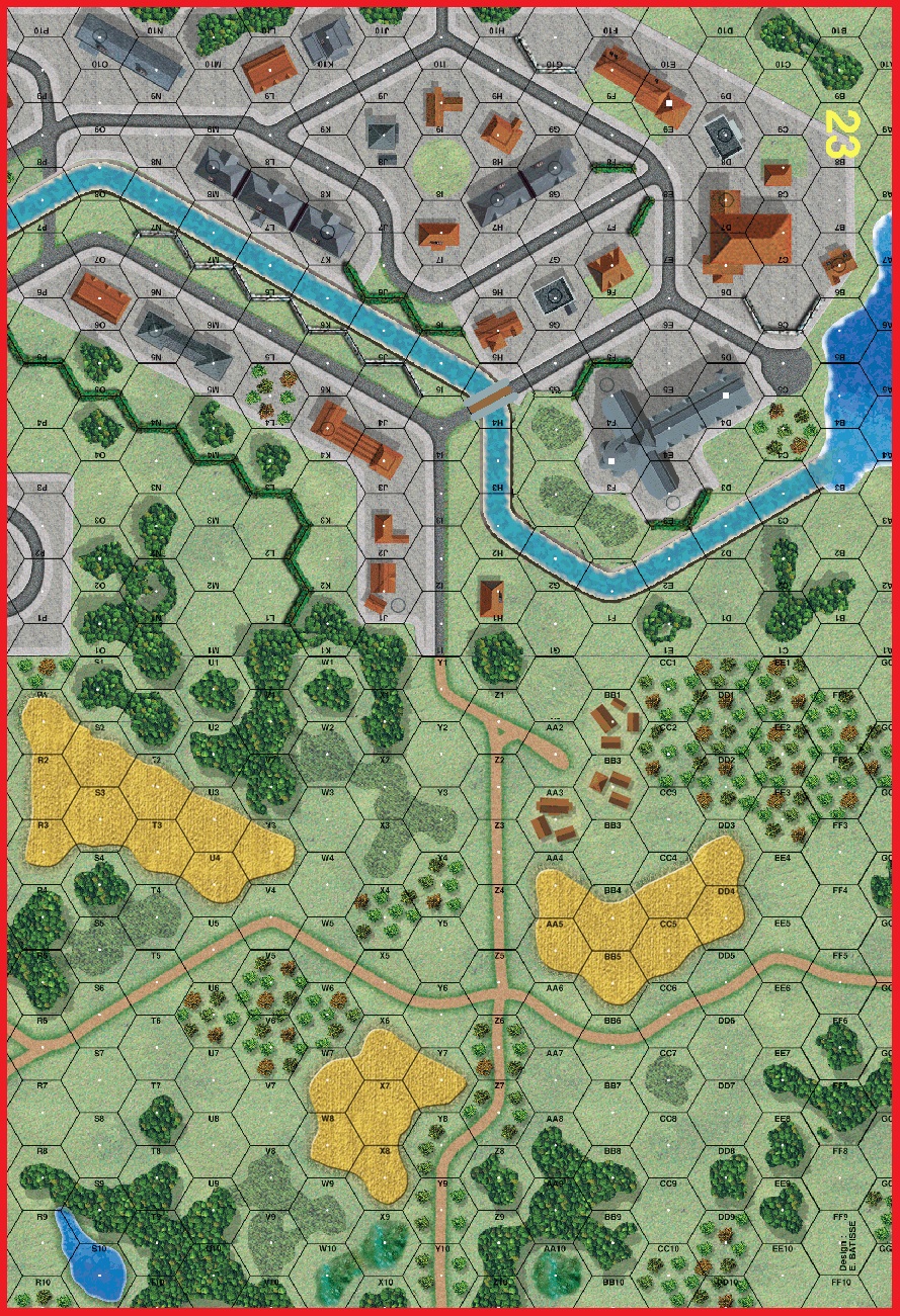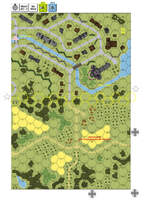 | Misc Rules: | Soft ground - AFVs pay 1 extra MP per non-road hexside; river impassable except by Bailey bridge |
