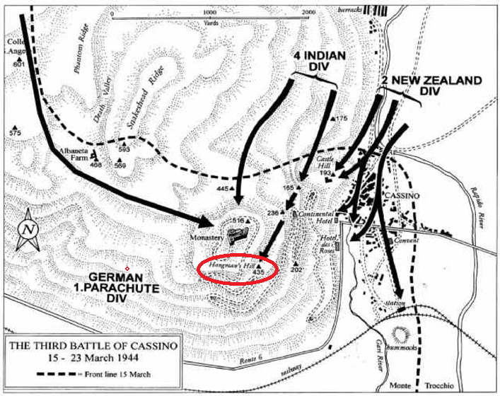 Continued assaults against the heights surrounding the monastery rewarded the New Zealand Corps only with more casualties and frustrations. At 1400 hours word came over the radio that C Company of the 1/9 Gurkhas had fought their way to the top of hangman's Hill and routed the German garrison there. The news was like a shot in the arm for the beleaguered Kiwis. in just a few hours, the 1/6 Rajputanas along with Companies A & B of 1/9 Gurkhas joined their comrades at the summit to await the inevitable counterattack. They didn't have long to wait.Attacker: German (1/4 Fallschirmjager Regt)