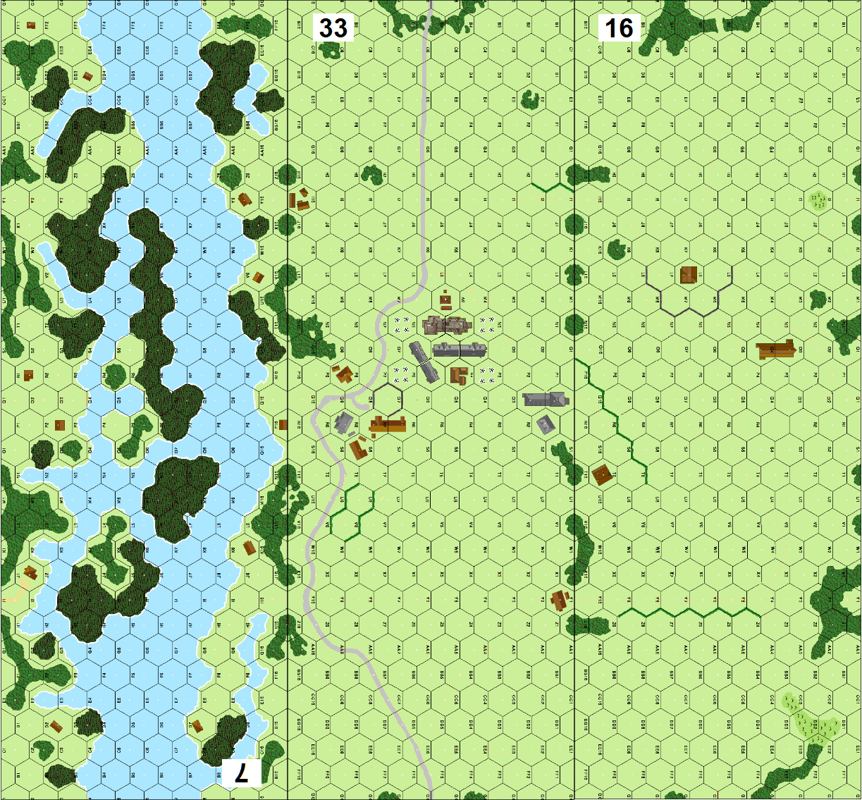 | Misc Rules: | No rowhouses. Only one road, paved. AFV Bog checks if not on road and > 2 hexes from bldgs |
