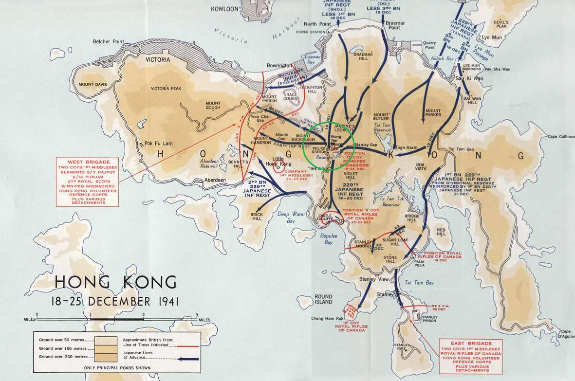 After the Japanese landings near North Point and Aldrich Bay, the Japanese forces began their drive south to the center of Hong Kong Island. Resistance was ineffective in a number of areas, however one exception was at the Wong Nai Chong Gap Police Station. The police station was located on a hill near a key road intersection in the center of the Wong Nai Chong Gap, making it a key position that effectively blocked the path of the Japanese advance.Attacker: Japanese (228th and 230th Regiments, 38th Division)