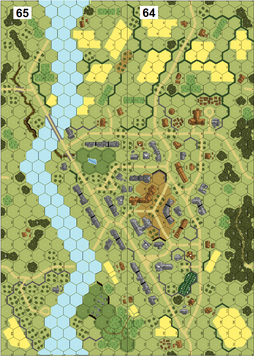 2024-01-04(D) Jeff B vs Magnus Rimvall Russian win10.25 hrsI contested the Germans strongly, like a beach landing, with just about every possible entry hex covered with potential fire. This would put me at risk of being subjected to some substantial return fire, but that's what commissars are for, and I had three of them. The 9-0 was wounded, but the Kubelwagan, gun, and crew were eliminated, and a few broken Gemans (including the HMG squad) had to run home to mommy. Turn 2 saw my 7-0, whose job was to help tote a MMG, taken out by a sniper. But the German 9-2/HMG/MMG stack were delayed with a pin result, keeping them off the front line for one more turn. Delay was the name of the game here, and my men did a good job of it, with the Germans making little forward progress on Turn 3. Turn 4 saw my tank guarding the western peninsula lose its MA for good, while the rest of our men out there continued to duke it out around the walled orchard. My 10-0 was gunned down trying to make a break across the east central streets, leaving that side of the board leaderless for me, except for the wounded 9-0 who was needed to help haul around the last MMG (the other being lost for good on a failed fix the turn before). Thankfully a bunch of dummies soaked up a lot of the remaining German fire. Turn 5 saw the Germans shrug off their first minefield find, my men tenuosuly cling to their meager hold in the middle, while the battle in the walled orchard in the west waged on. Turn 6 finally saw the Germans break free in this area (with Russians hot on their heels), but it would be too little too late. My central defense toughened up for one more turn of precious delay. With the continuous fighting withdrawl of the Russians, the German radio really had no time or place to get into position. When it finally was ready to drop some smoke it lost its dial. The Germans in the center were finally freed up to gain a bit of ground, but with lots of wire and a secondary Russian line of defense to get past there was really no chance to make it to the bridge, let alone claim it, so they conceded. Quite a fun scenario, with the multiple battlefronts entertaining. Beware of shots across the river!