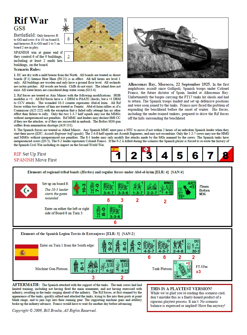 In the first amphibious assault since Gallipoli, Spanish troops under Colonel Franco, the future dictator of Spain, landed at Alhucemas Bay. Unfortunately the barges carrying the FT17 tanks hit shoals and had to return. The Spanish troops landed and set up defensive positions and were soon joined by the tanks. Franco now faced the problem of expanding the beachhead before the onset of winter. His forces, including the under-trained tankers, prepared to drive the Rif forces off the hills surrounding the beachhead.Attacker: Spanish (Spanish Legion Tercio de Extranjeros)