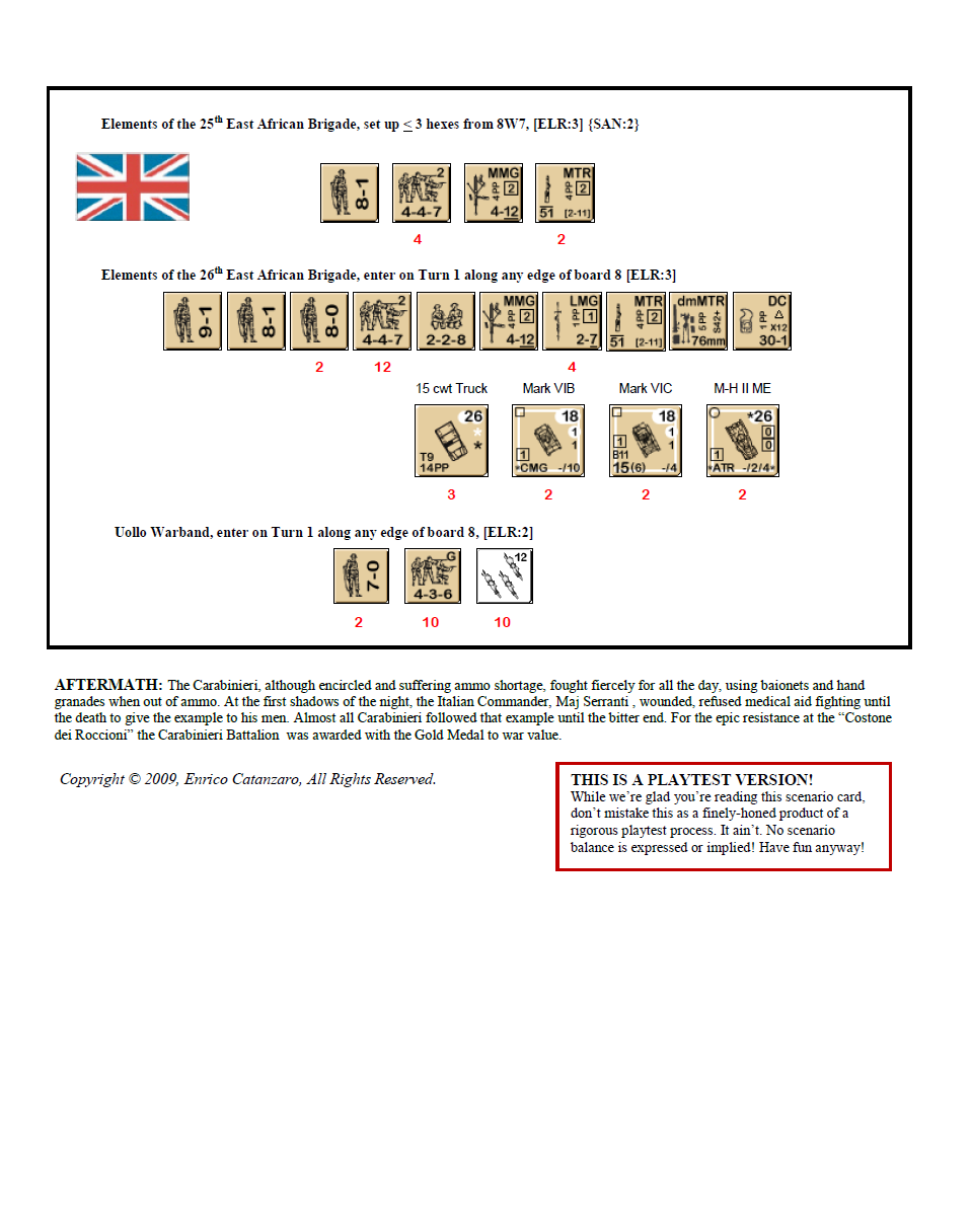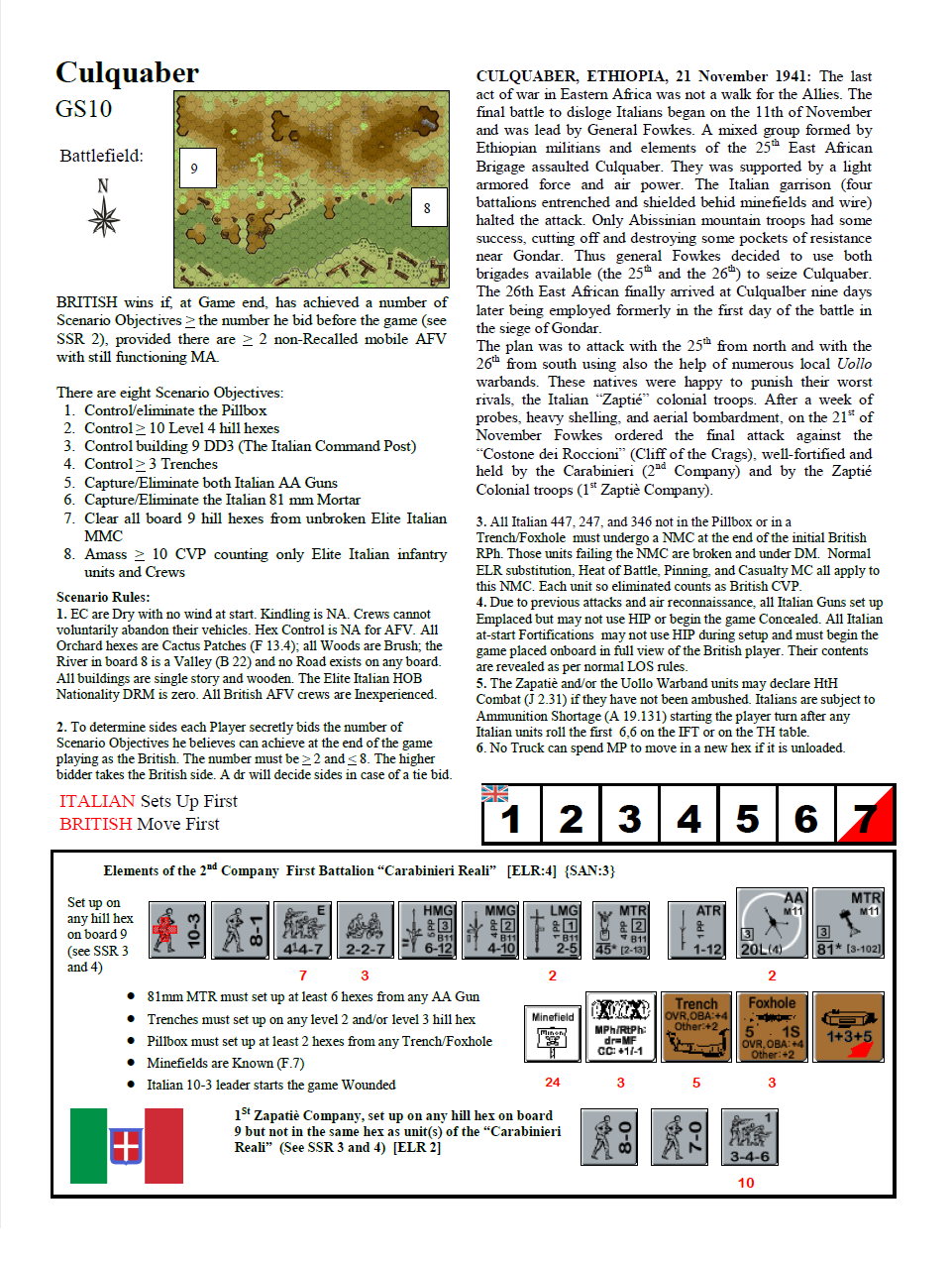 The last act of war in Eastern Africa was not a walk for the Allies. The final battle to dislodge Italians began on the 11th of November and was led by General Fowkes. A mixed group formed by Ethiopian militia and elements of the 25th East African Brigade assaulted Culquaber. They were supported by a light armoured force and air power. The Italian garrison (four battalions entrenched and shielded behind minefields and wire) halted the attack. Only Abyssinian mountain troops had some success, cutting off and destroying some pockets of resistance near Gondar. Thus General Fowkes decided to use both brigades available (the 25th and the 26th) to seize Culquaber. The 26th East African finally arrived at Culquaber nine days later being employed formerly in the first day of the battle in the siege of Gondar. The plan was to attack with the 25th from the north, the 26th from the south and with the help of numerous local Uollo warbands. These natives were happy to punish their worst rivals, the Italian “Zaptié” colonial troops. After a week of probes, heavy shelling and aerial bombardment, Fowkes ordered the final attack on the 21st of November against the “Costone dei Roccioni” (Cliff of the Crags), well-fortified and held by the Carabinieri (2nd Company) and by the Zaptié Colonial troops (1st Zaptiè Company).Attacker: British (25th and 26th East African Brigades and Uollo Warband)