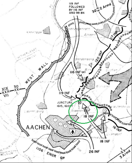 In the 1st Infantry Division’s drive to capture Aachen, the 1st Battalion of Col. George Smith’s 18th Infantry Regiment was ordered to capture a fortified hill near Haaren known as Crucifix Hill. Employing special pillbox assault teams equipped with flamethrowers, Bangalore torpedoes, and demolition charges, the 1st Battalion would also be provided with direct fire support from a battery of tank destroyers and self-propelled guns. As the leading rifle platoon of Company C assaulted the first pillbox, flanking fire from a nearby gun emplacement caught the platoon in a crossfire.Attacker: American (Company C, 18th Infantry Regiment, 1st Infantry Division / Ranger Company)