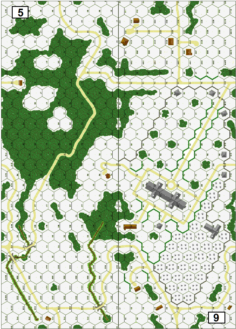 | Misc Rules: | GS at start, poss EW with DRs on turns. D: FB6, Wire, Entrenchments, Pillboxes |