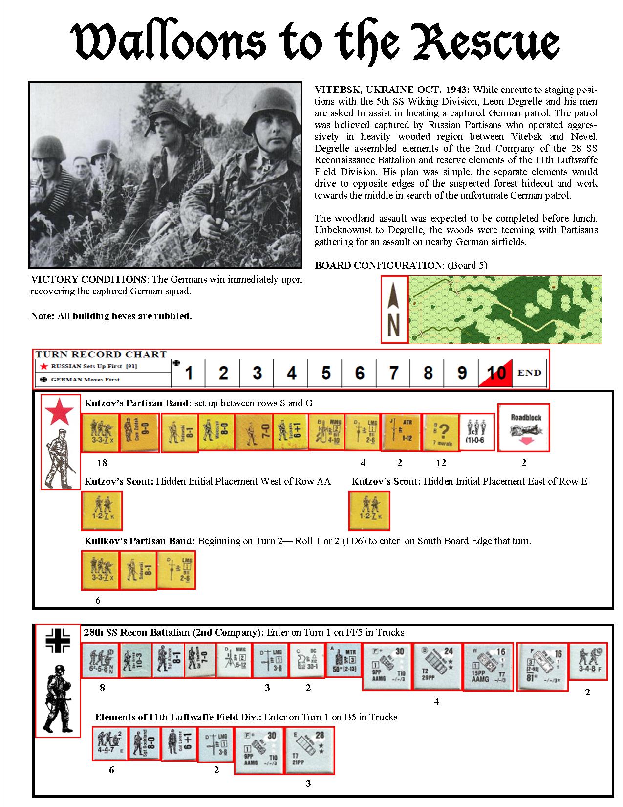 While enroute to staging positions with the 5th SS Wiking Division, Leon Degrelle and his men are asked to assist in locating a captured German patrol. The patrol was believed captured by Russian Partisans who operated aggressively in heavily wooded region between Vitebsk and Nevel. Degrelle assembled elements of the 2nd Company of the 28th SS Reconaissance Battalion and reserve elements of the 11th Luftwaffe Field Division. His plan was simple, the separate elements would drive to opposite edges of the suspected forest hideout and work towards the middle in search of the unfortunate German patrol. The woodland assault was expected to be completed before lunch. Unbeknownst to Degrelle, the woods were teeming with partisans gathering for an assault on nearby German airfields.Attacker: German (2nd Company, 28th SS Recon Battalion and 11th Luftwaffe Field Division)