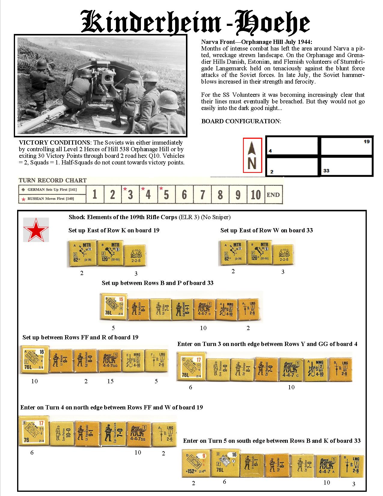 Months of intense combat has left the area around Narva a pitted, wreckage strewn landscape. On the Orphanage and Grenadier Hills, Danish, Estonian, and Flemish volunteers of Sturmbrigade Langemarck held on tenaciously against the blunt force attacks of the Soviet forces. In late July, the Soviet hammer-blows increased in their strength and ferocity. For the SS Volunteers it was becoming increasingly clear that their lines must eventually be breached. But they would not go easily into the dark good night...Attacker: Russian (109th Rifle Corps)