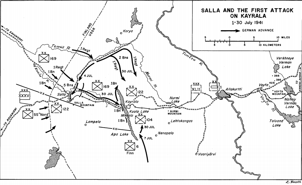 Now that Salla formed the boundary between Finland and Russia, the Russians had fortified the area -- especially the road leading to Salla from the Finnish border. As part of a three-pronged attack -- Finns attacked from the north, Wehrmacht from the south while the untested SS Kampfgruppe Nord had the main thrust down the long forested road. Supported the massed artillery, air support and captured French armor, the attack commenced.Attacker: German (SS) (Elements of 7th SS Infantry Regiment and the 211st Panzer Battalion)