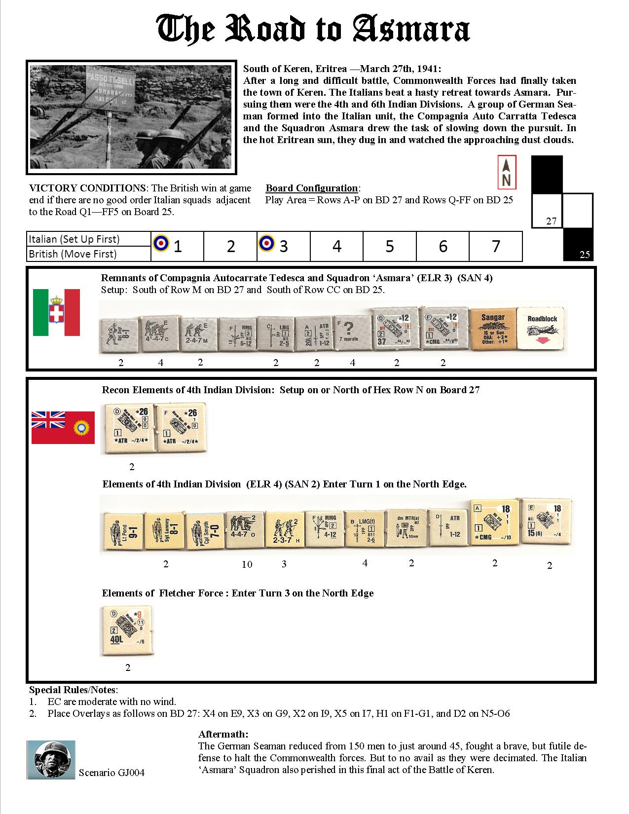 After a long and difficult battle, Commonwealth forces had finally taken the town of Keren. The Italians beat a hasty retreat towards Asmara. Pursuing them were the 4th and 6th Indian Divisions. A group of German seamen formed into an Italian unit, the Compagnia Auto Carratta Tedesca and the Squadron Asmara drew the task of slowing down the pursuers. In the hot Eritrean sun, they dug in and watched the approaching dust clouds. . .Attacker: British (4th Indian Division and Fletcher Force)