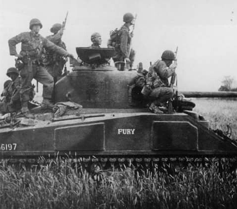 American infantry ride on 'Fury,' Tank F-2 of 'F' Company, 66th Armored Regiment, 2nd Armored Division