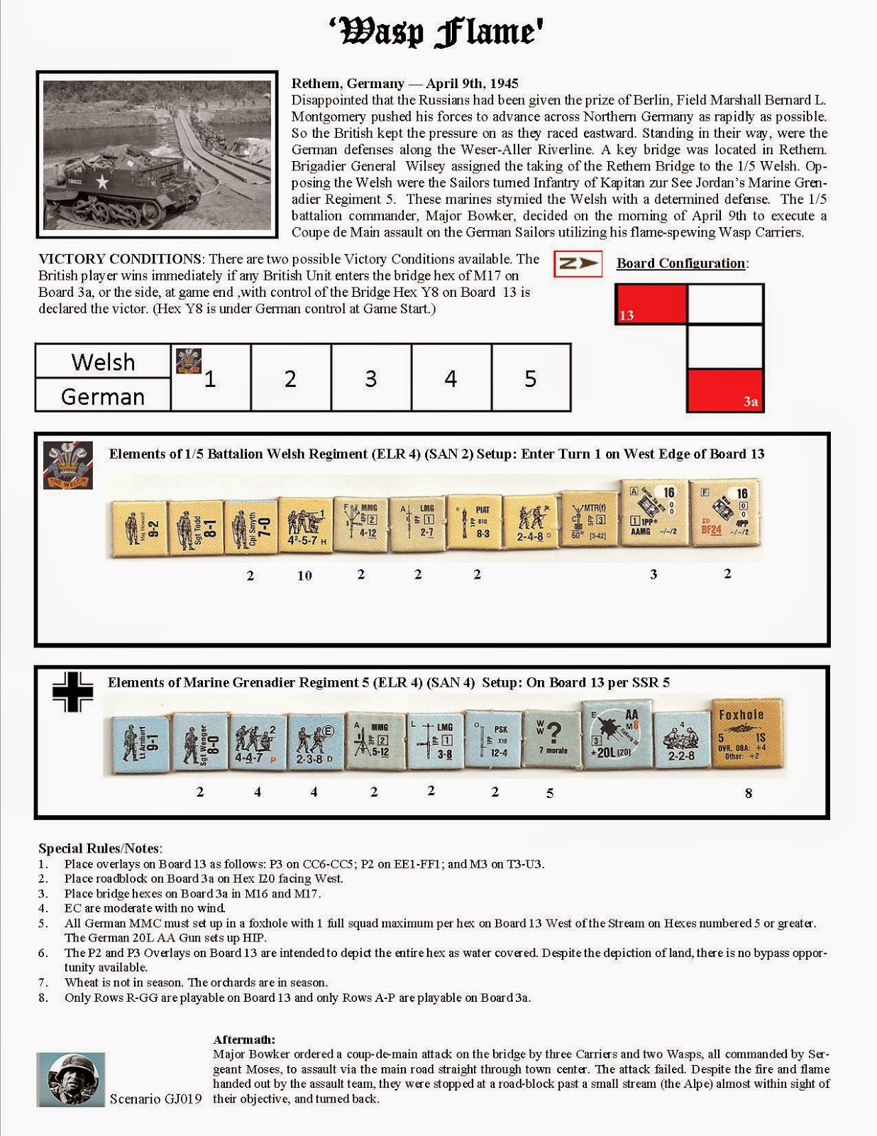 Disappointed that the Russians had been given the prize of Berlin, Field Marshall Bernard Montgomery pushed his forces to advance across Northern Germany as rapidly as possible. So the British kept the pressure on as they raced eastward. Standing in their way were the German defenses along the Weser-Aller riverline. A key bridge was located in Rethem. Brigadier General Wilsey assigned the taking of Rethem Bridge to the 1/5 Welsh. Opposing the Welsh were the sailors-turned-infantry of Kaptain zur See Jordan’s Marine Grenadier Regiment 5. There marines stymied the Welsh with a determined defense. The 1/5 battalion commander, Major Bowker, decided on the morning of April 9th to execute a coupe de main assault on the German sailors, utilizing his flame-spewing Wasp Carriers. Three Carriers and two Wasps assaulted via the main road, straight through the town center.Attacker: British (1/5 Battalion Welsh Regiment)